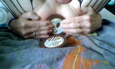 voller film mit löffelinjektion in die stange und elektrischem sack im kaffee bis zum abspritzen